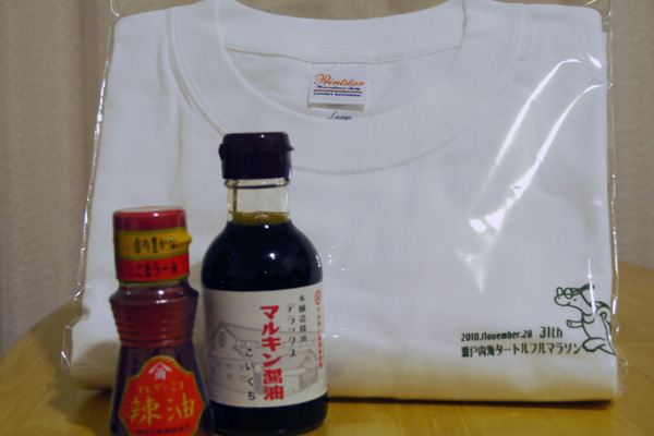 かどやのごま油とお醤油とタートルマラソンロゴ入りの白Tシャツ^^